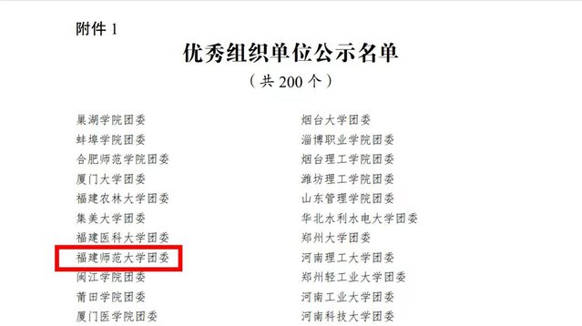 1、12月23日,我校共青团第十五次代表大会隆重召开。会上,团省委书记李腾发表讲话,他充分肯定了学校共青团自第十四次代表大会以来的各项工作成绩,并提出殷切希望。潘玉腾书记在讲话中指出此次团代会的重要意义,并代表学校党委向全校各级团组织和团员青年提出四点要求。大会听取、审议并通过了《高举旗帜跟党走踔厉奋发勇担当为加快建成富有鲜明特色的综合性全国一流大学贡献青春力量》的工作报告,选举产生了共青团福建师范大学第十五届委员会委员,通过了《关于共青团福建师范大学第十四届委员会工作报告的决议》。