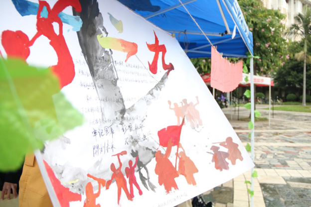 活动现场,学生社团各展风采,以“一二·九”爱国学生运动为主题,对帐篷设点进行精美的装饰,各社团还设置了与协会性质相关的小游戏,如考研协会的猜红歌、记单词游戏,绿色环保协会的树叶涂鸦等。